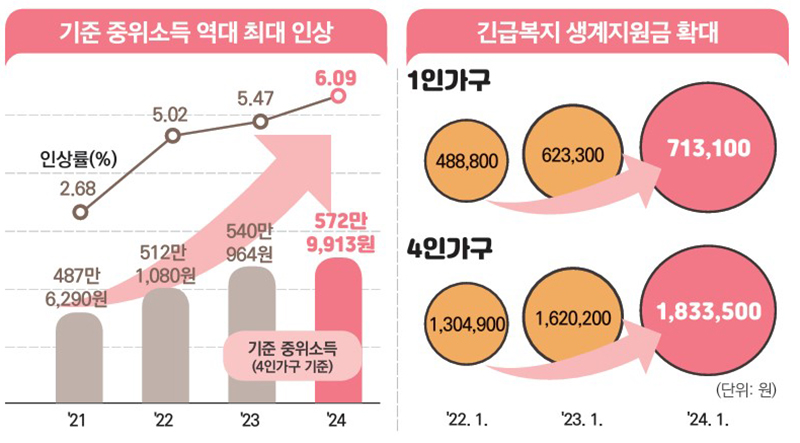윤석열 정부는 기초생활보장제도를 비롯한 정부 73개 복지사업의 선정기준 등으로 활용되는 기준 중위소득을 2년 연속 역대 최고수준으로 인상했다.