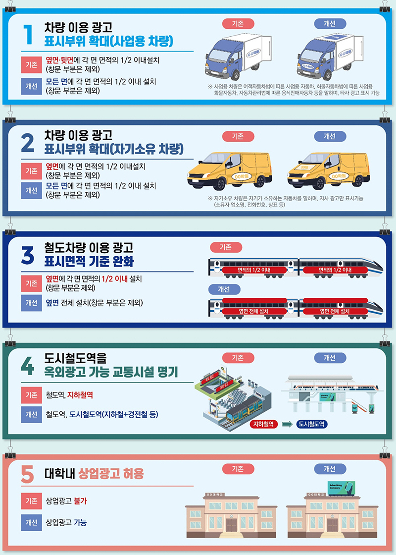 또한 경전철과 모노레일 등 철도 차량의 광고면을 기존보다 확대해 창문 부분을 제외한 옆면 전체 면적에 광고물을 표시할 수 있다.