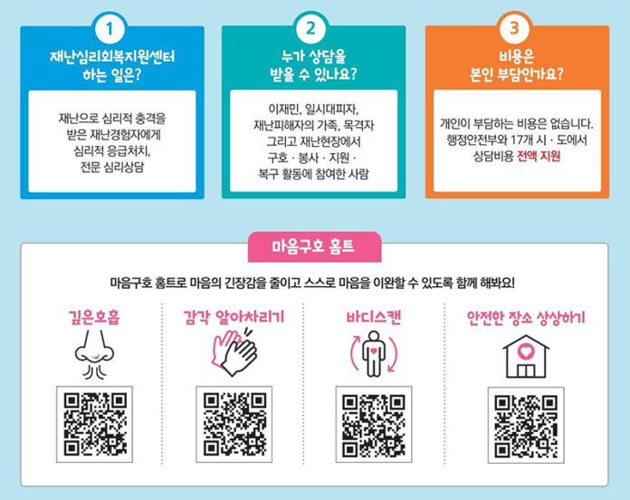 이에 이번 지진으로 마음이 힘든 국민은 누구든지 시·도 재난심리회복지원센터에 방문 또는 전화(1670-9512)하면 심리상담을 받을 수 있다.