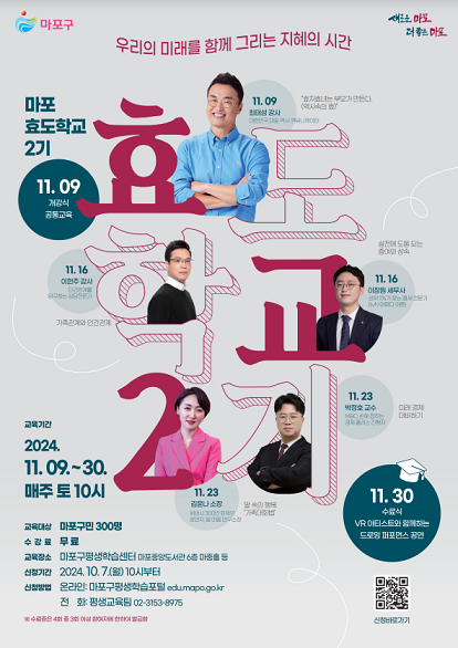 마포구(구청장 박강수)는 현대에 맞는 효의 가치와 실천 방안을 제시할 ‘마포 효도학교’의 2기 참여자를 선착순으로 모집한다.